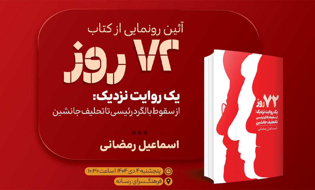مراسم رونمایی از کتاب «۷۲ روز؛ یک روایت نزدیک از سقوط بالگرد رئیسی تا تحلیف جانشین» نوشته اسماعیل رمضانی، به همت انتشارات سیمای شرق، روز پنج‌شنبه ۴ دی ۱۴۰۴ با حضور جمعی از استادان و فعالان حوزه ارتباطات در فرهنگسرای رسانه برگزار شد.