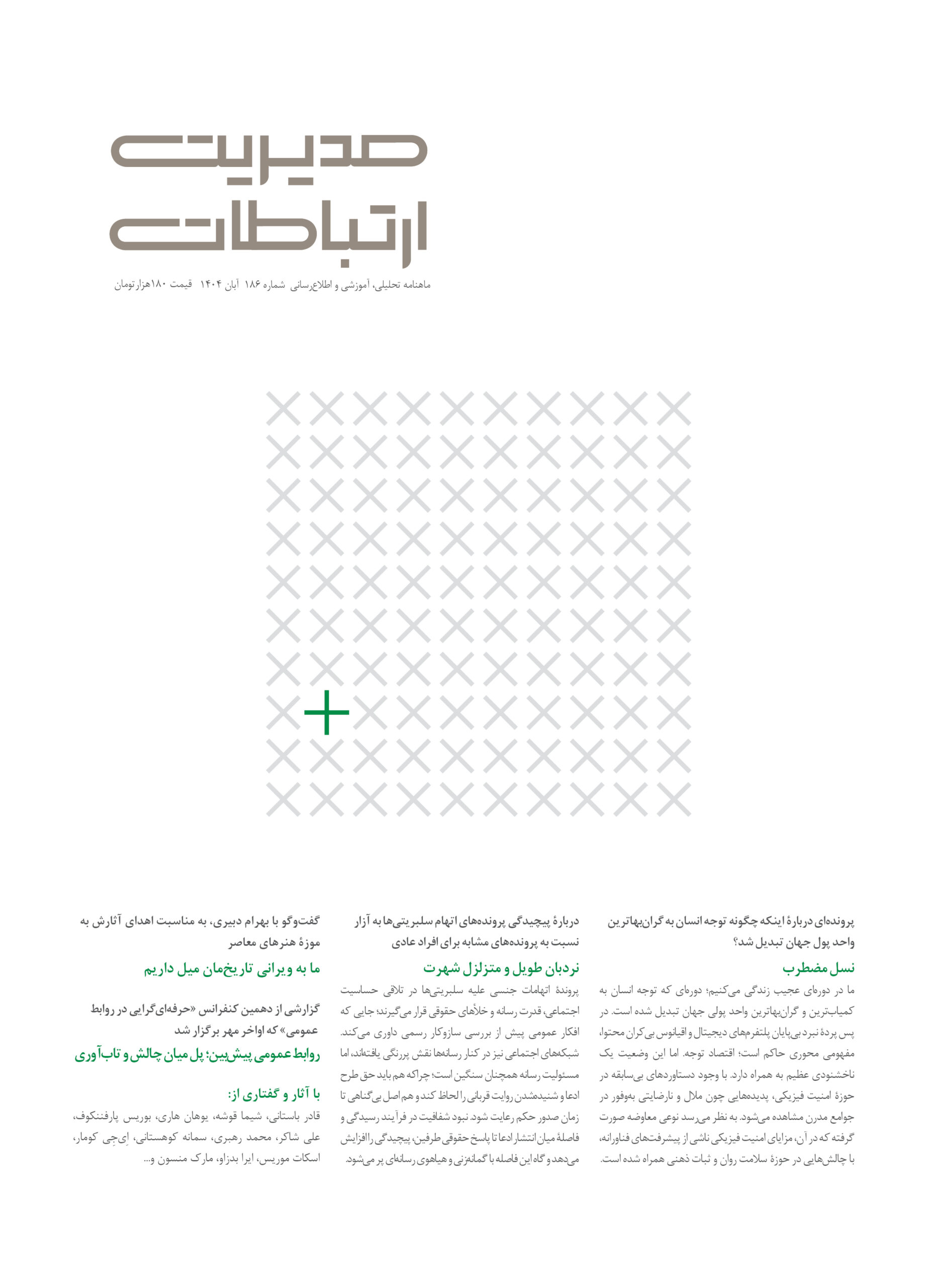 شماره ۱۶۳ ماهنامه مدیریت ارتباطات به مدیر مسئولی امیرعباس تقیپور و سردبیری علی ورامینی منتشر شد. در این شماره مفاهیم مهمِ پروپاگاندا، اطلاعات نادرست، دروغ پراکنی و سایبربولی بررسی شدهاند و اینکه مجموع پیاده شدن اینها چطور میتوانند فهم غیر واقعی به کاربران بیشمار بدهند.